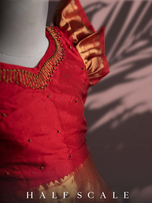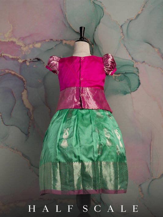 Scarlet Red and Mint Green Pure Silk Pavadai Set – Zari Border & Embroidery