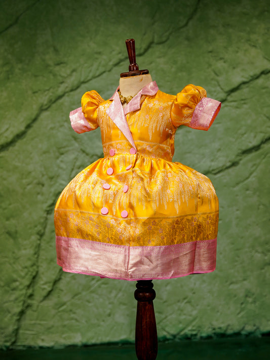 Sunshine Yellow & Pink Kanchipuram Silk Kids Gown with Jacket Style