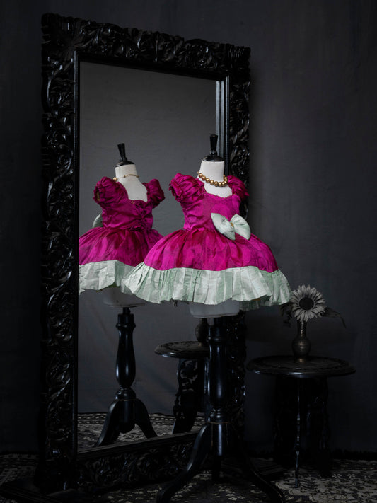 Magenta with Pleated Light Green Kanchi Pattu Frocks for Babies | Kids Wedding Dresses