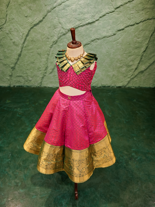 Kids Kanchipuram Silk Lehenga Gown – Gold with Pink Accent