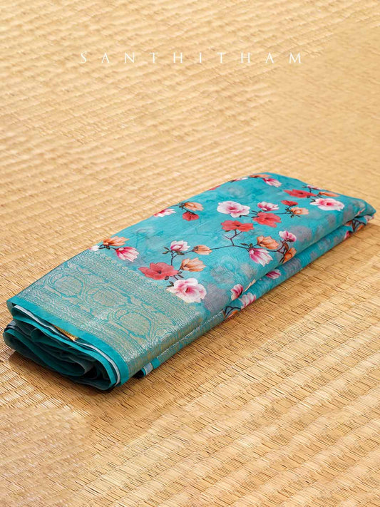 Alice Blue Floral Print Cotton Saree
