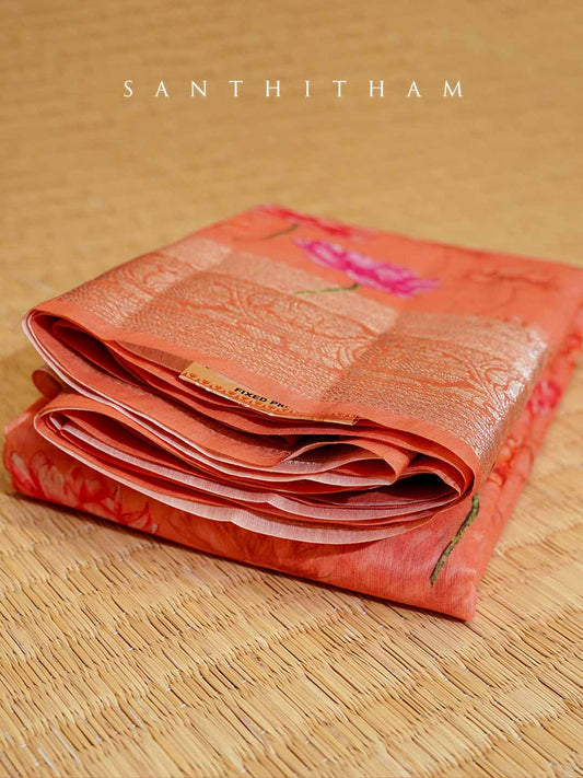 Burnt Orange Floral Print Cotton Saree