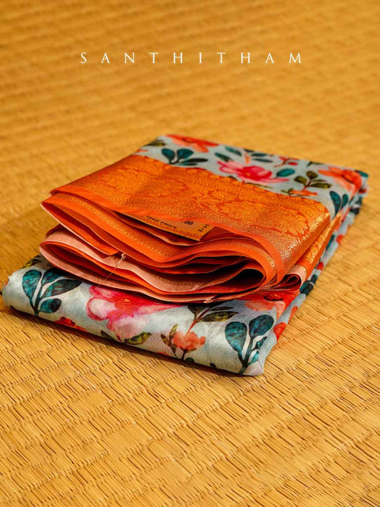Powder Blue and Tangerine Orange Floral Print Cotton Saree