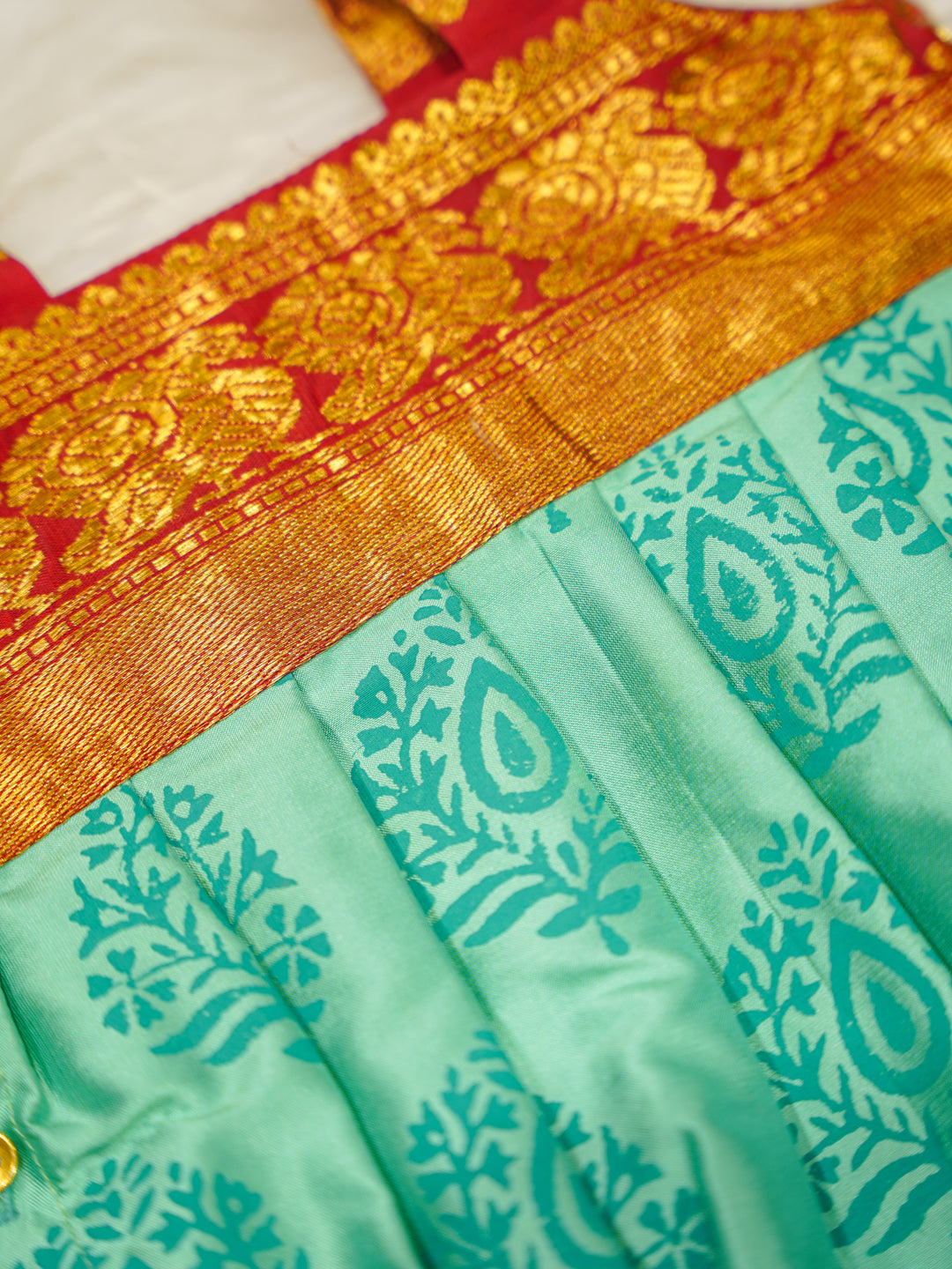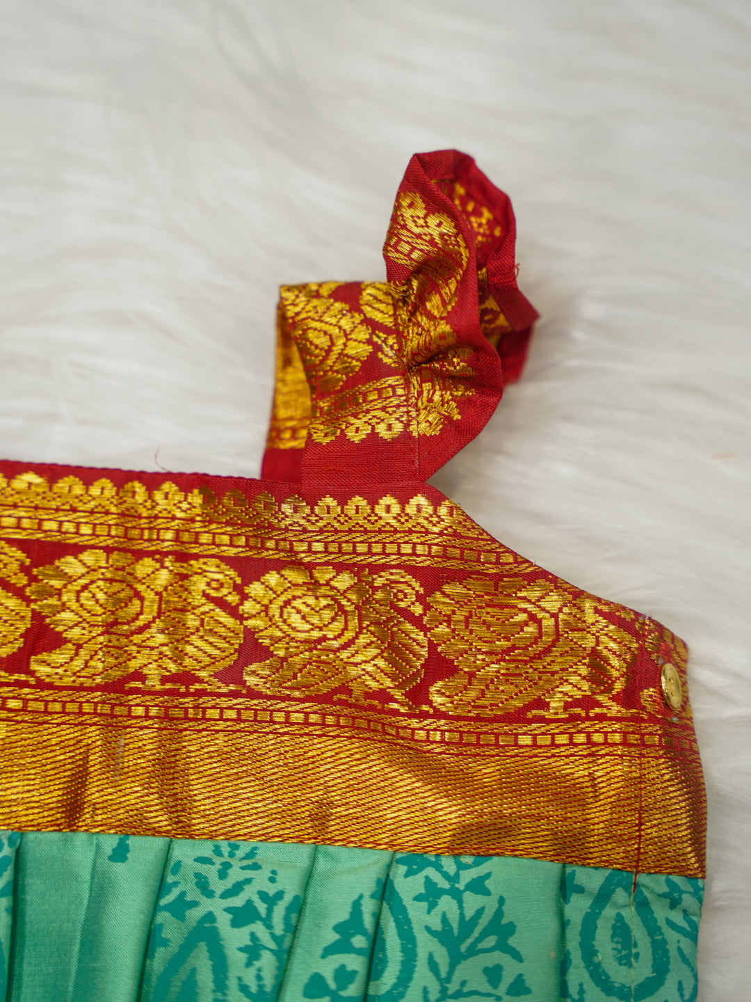 A refreshing take on traditional newborn wear, this aqua teal silk romper features intricate woven motifs paired with a rich red and gold zari yoke. The softly pleated silhouette ensures comfort while preserving a festive, heirloom look. Finished with easy snap closures and paired with matching silk booties, this set is perfect for your baby’s special milestones.