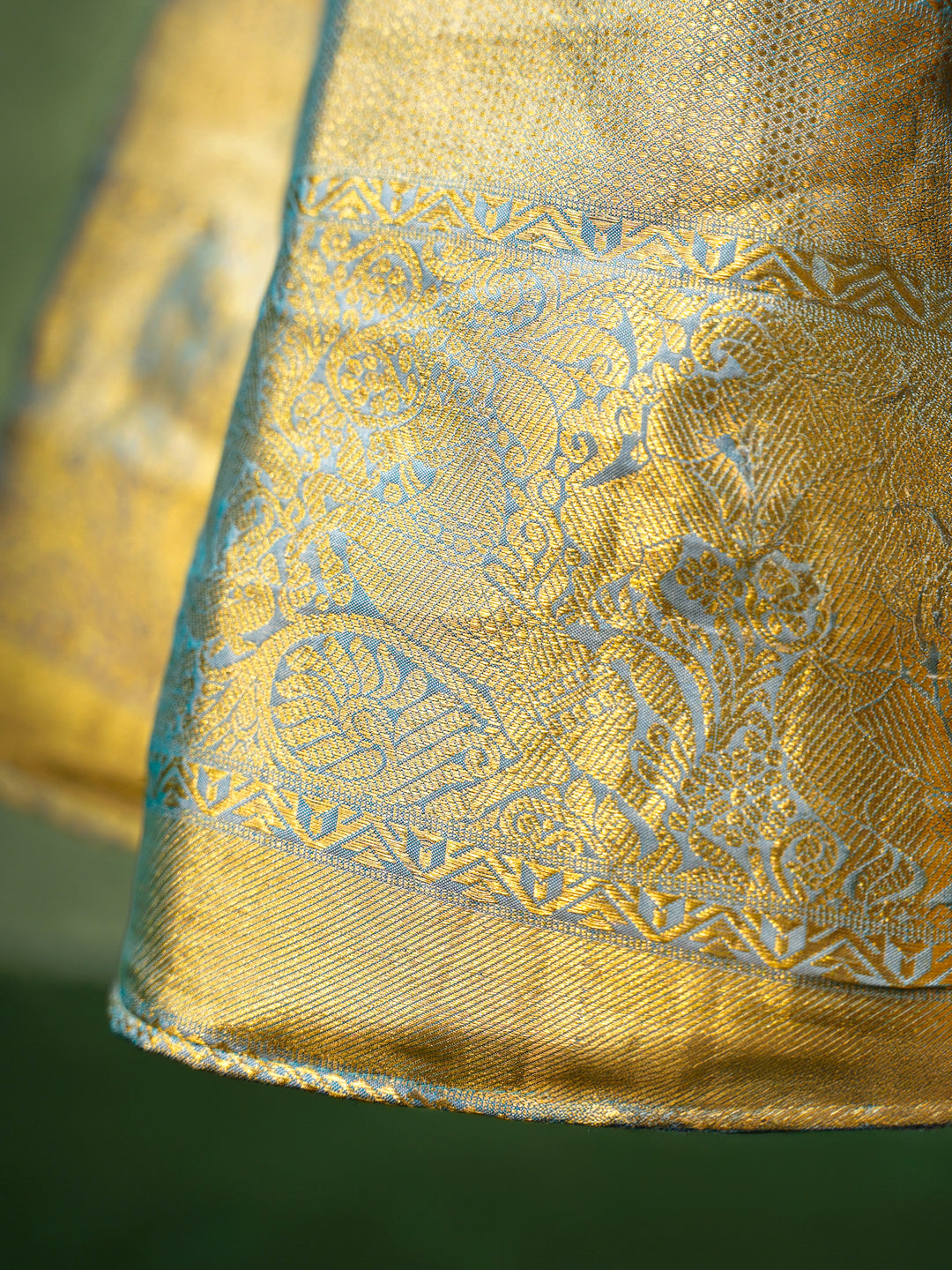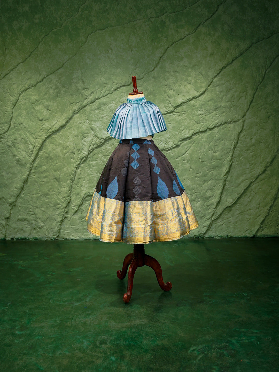 Black & Teal Diamond Weave Kanchipuram Kids Gown with Golden Border