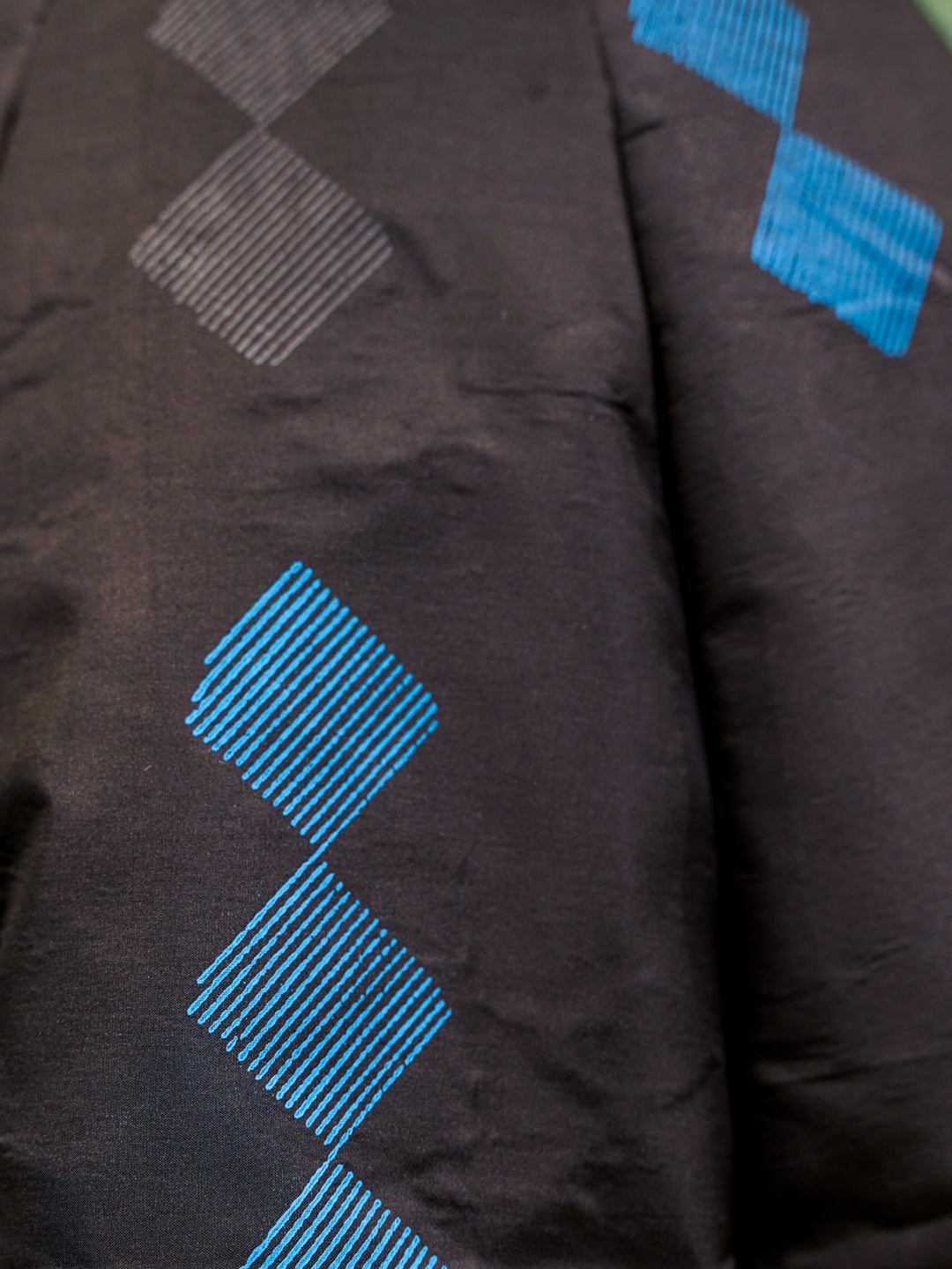 This elegant kids gown is crafted from pure Kanchipuram silk, featuring bold black with teal diamond motifs and a rich golden zari border. Paired with a pastel pleated cape, it creates a refined blend of tradition and modern styling for festive occasions.