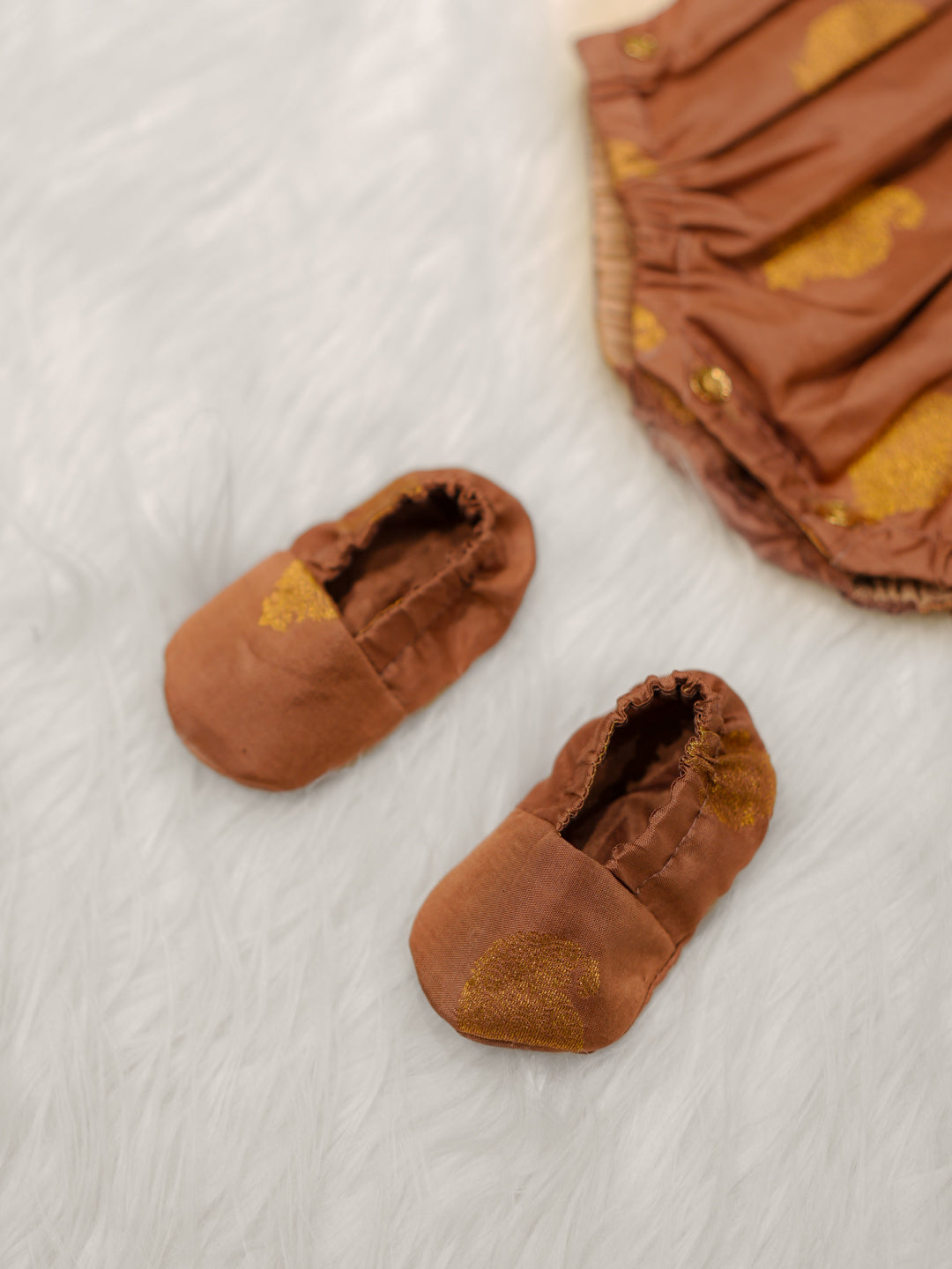 Designed with a rich brown base and gold-toned detailing, this romper offers a traditional look while keeping your little one comfortable all day.