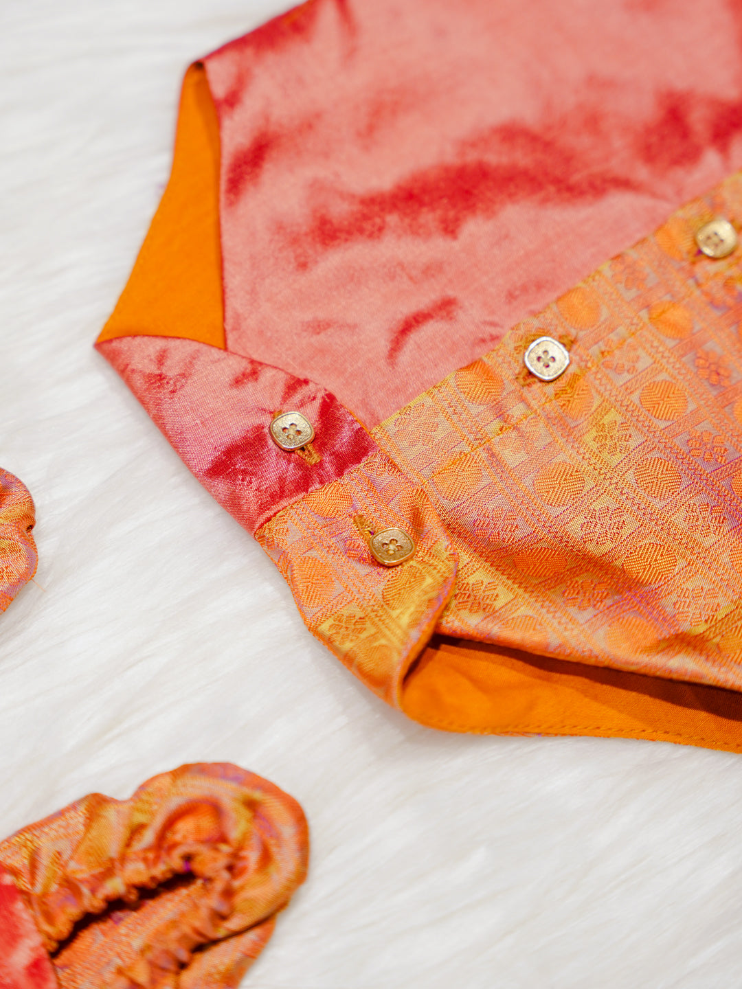 Coral Orange Kanchipuram Silk Shirt-Style Baby Romper with Shoes