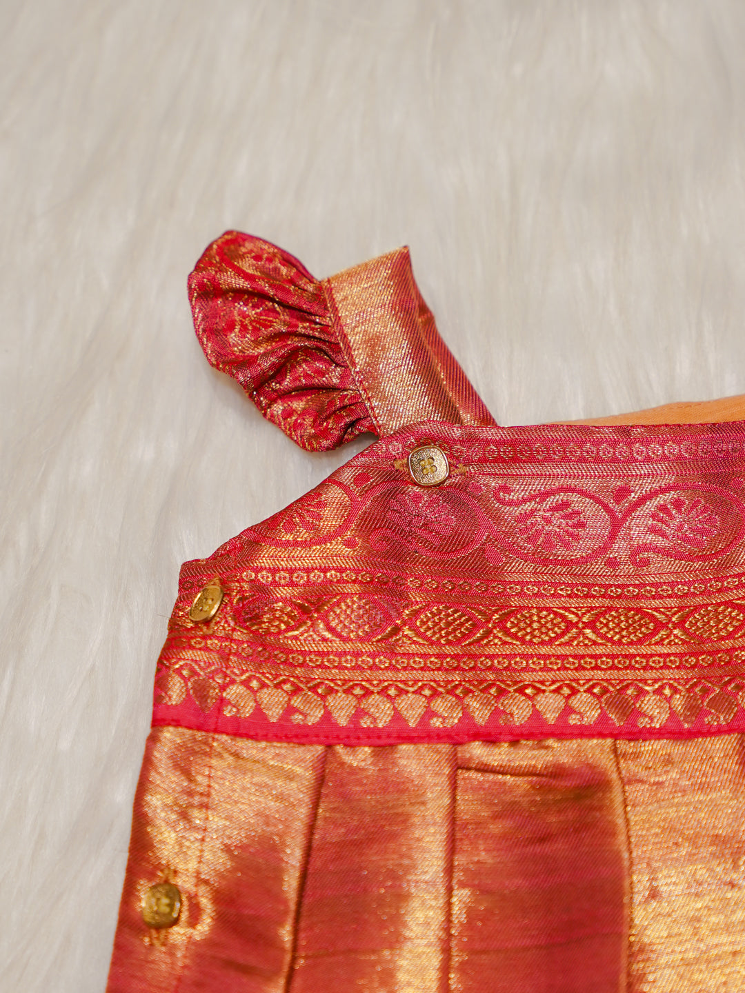 Coral Pink Kanchipuram Silk Baby Romper Set with Shoes