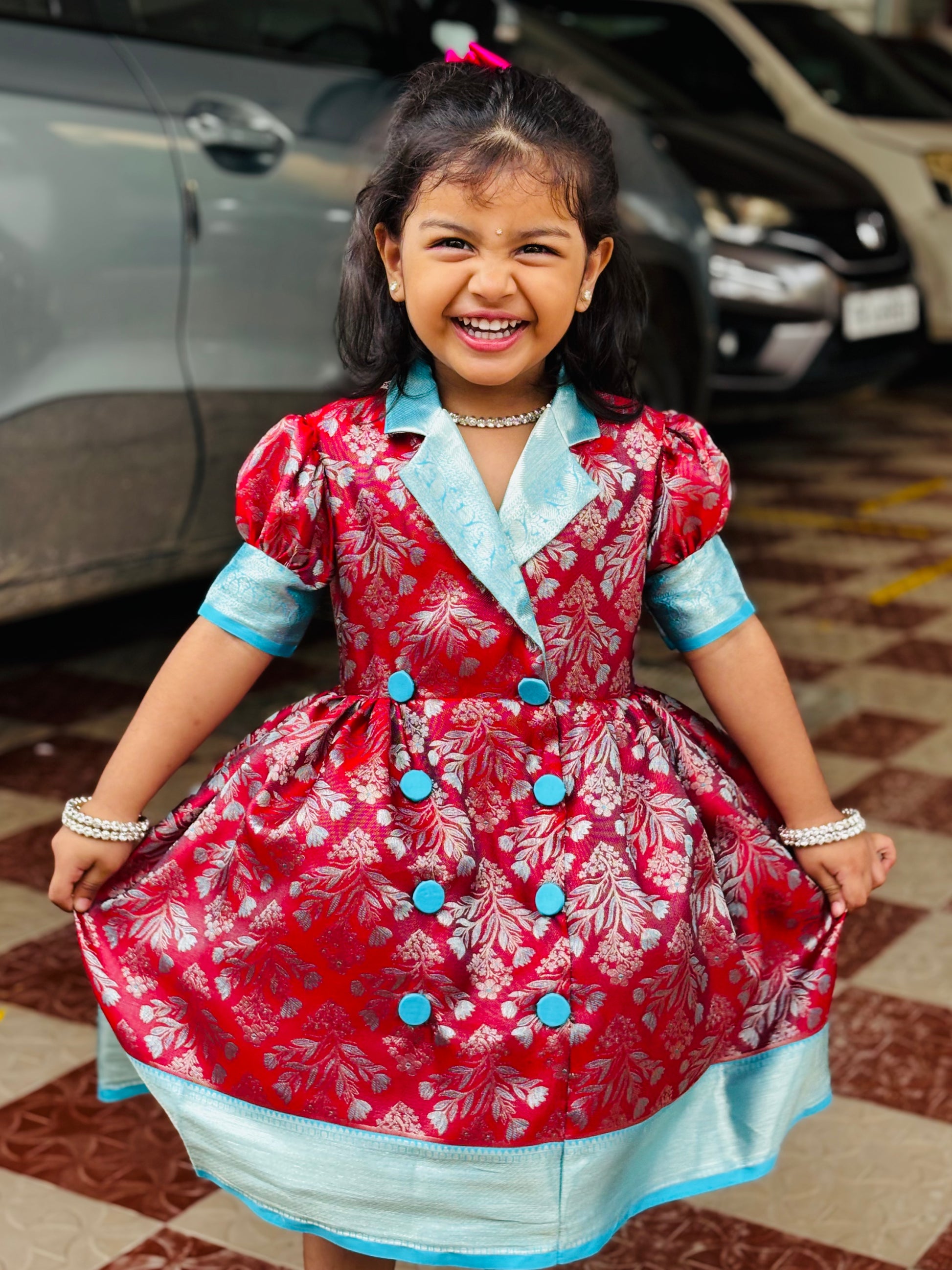 Crimson Red & Aqua Blue Kanchipuram Silk Kids Gown with Jacket Styling