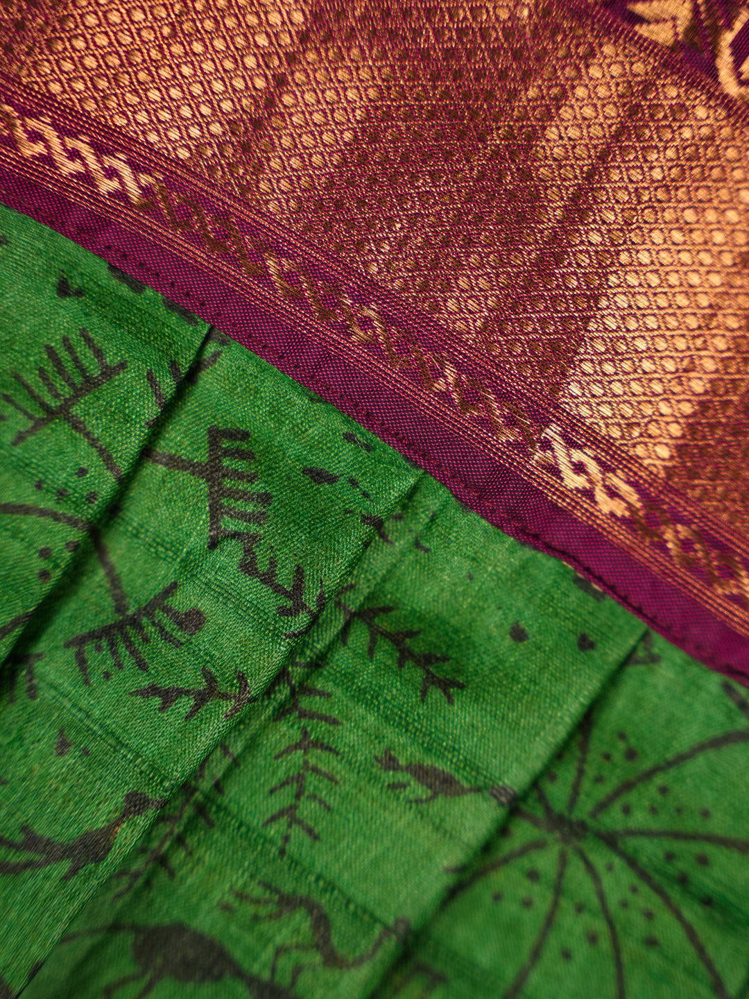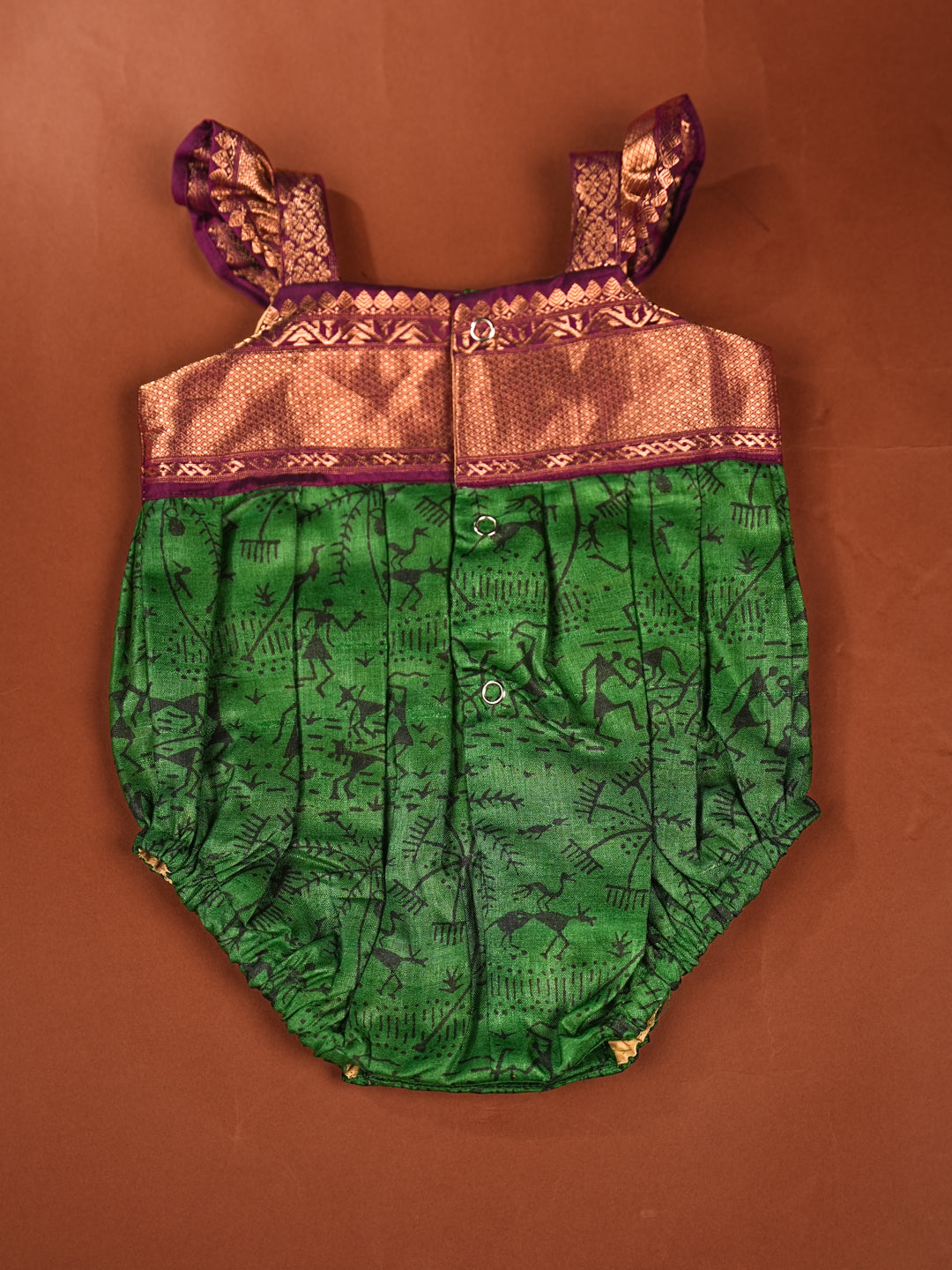 Wrap your little one in the charm of tradition with the Emerald Bloom silk romper – a fusion of cultural elegance and delightful comfort. Crafted with a regal emerald green silk bodice adorned with delicate golden floral embroidery, this romper gracefully flows into a soft pastel yellow pleated silk base with intricate jacquard patterns. A perfect blend of heritage and playfulness for special celebrations.