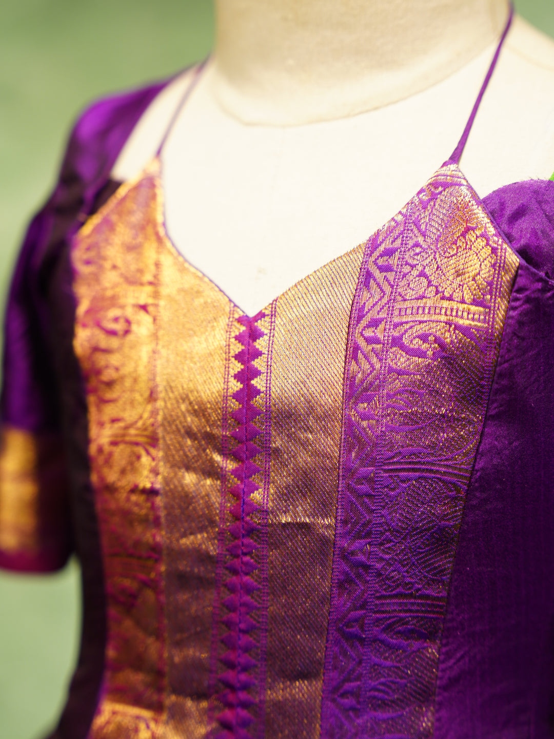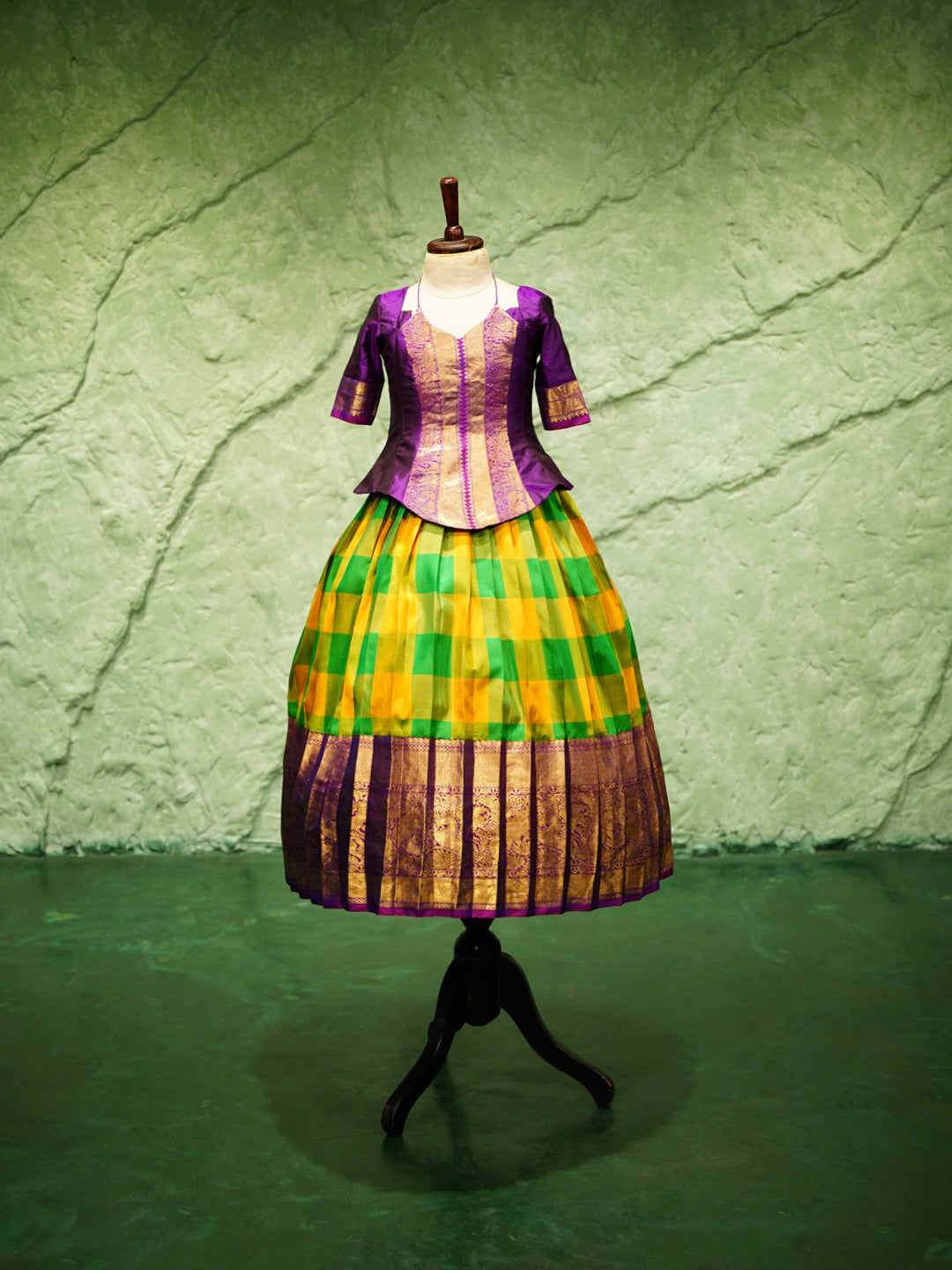 This Pattu Pavadai is handwoven in pure Kanchipuram silk, blending rich purple and vibrant mustard checks that glow with heritage. The bodice, tailored in royal purple with zari panel detailing, mirrors the grace of temple architecture, while the skirt in mustard and green checks adds a playful charm to its regal elegance.