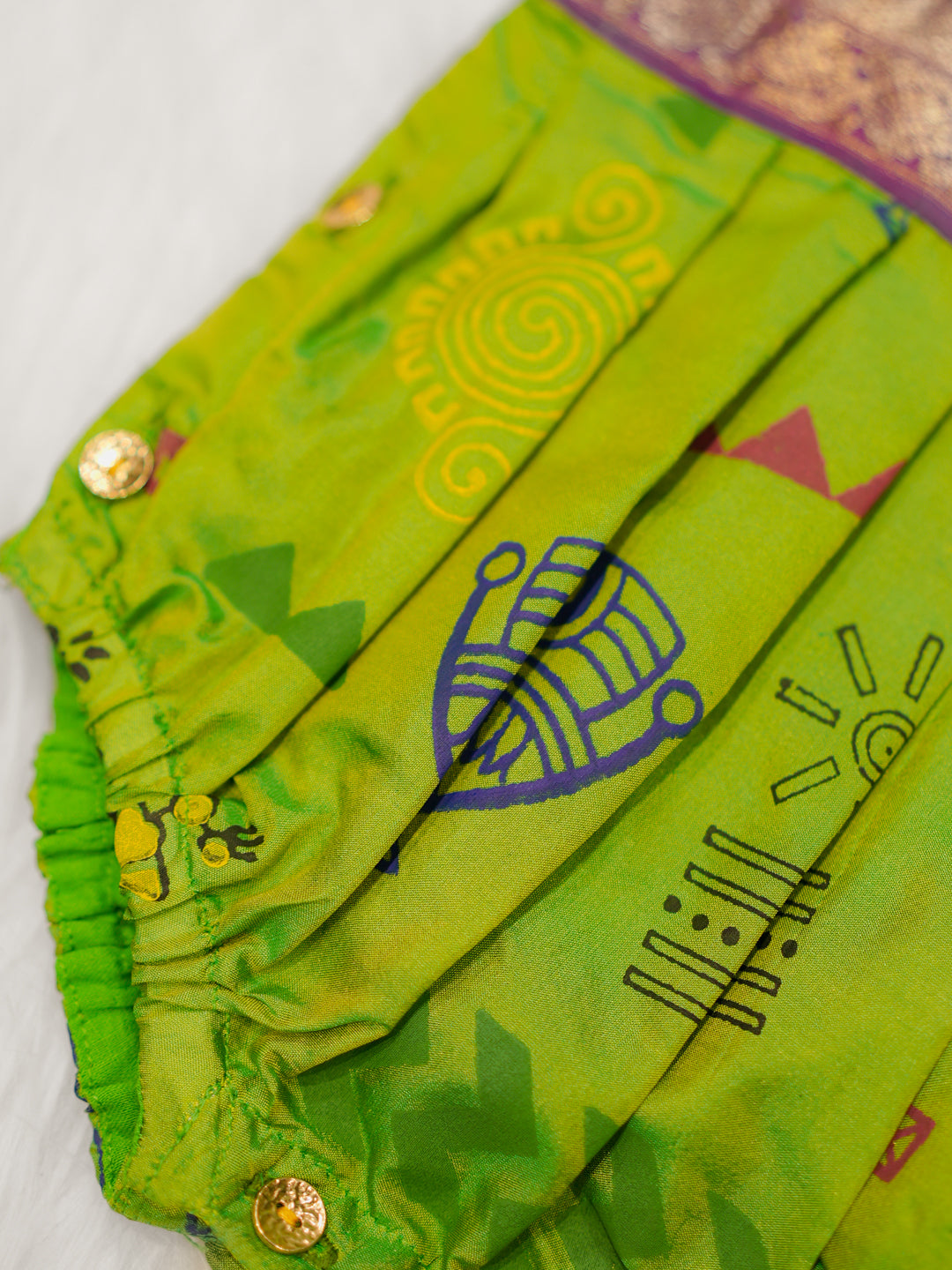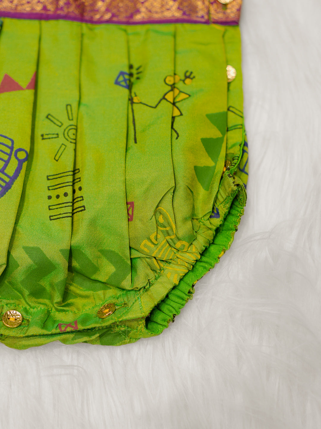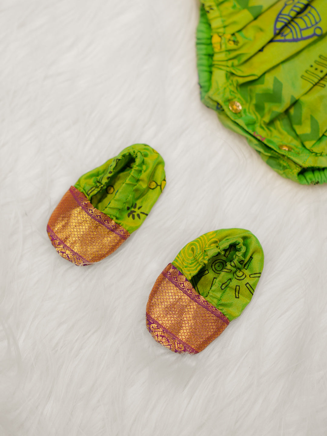 Crafted in soft fabric with playful tribal-inspired prints, this romper features a zari-finish yoke and comes with matching booties for a complete festive look.