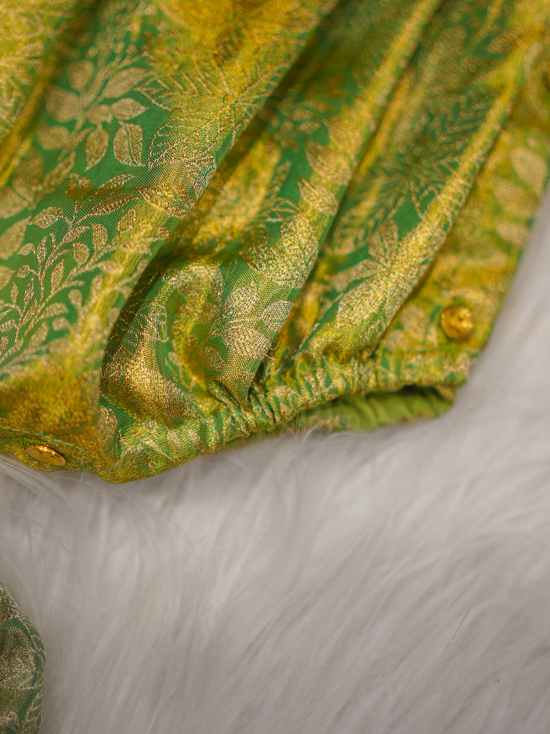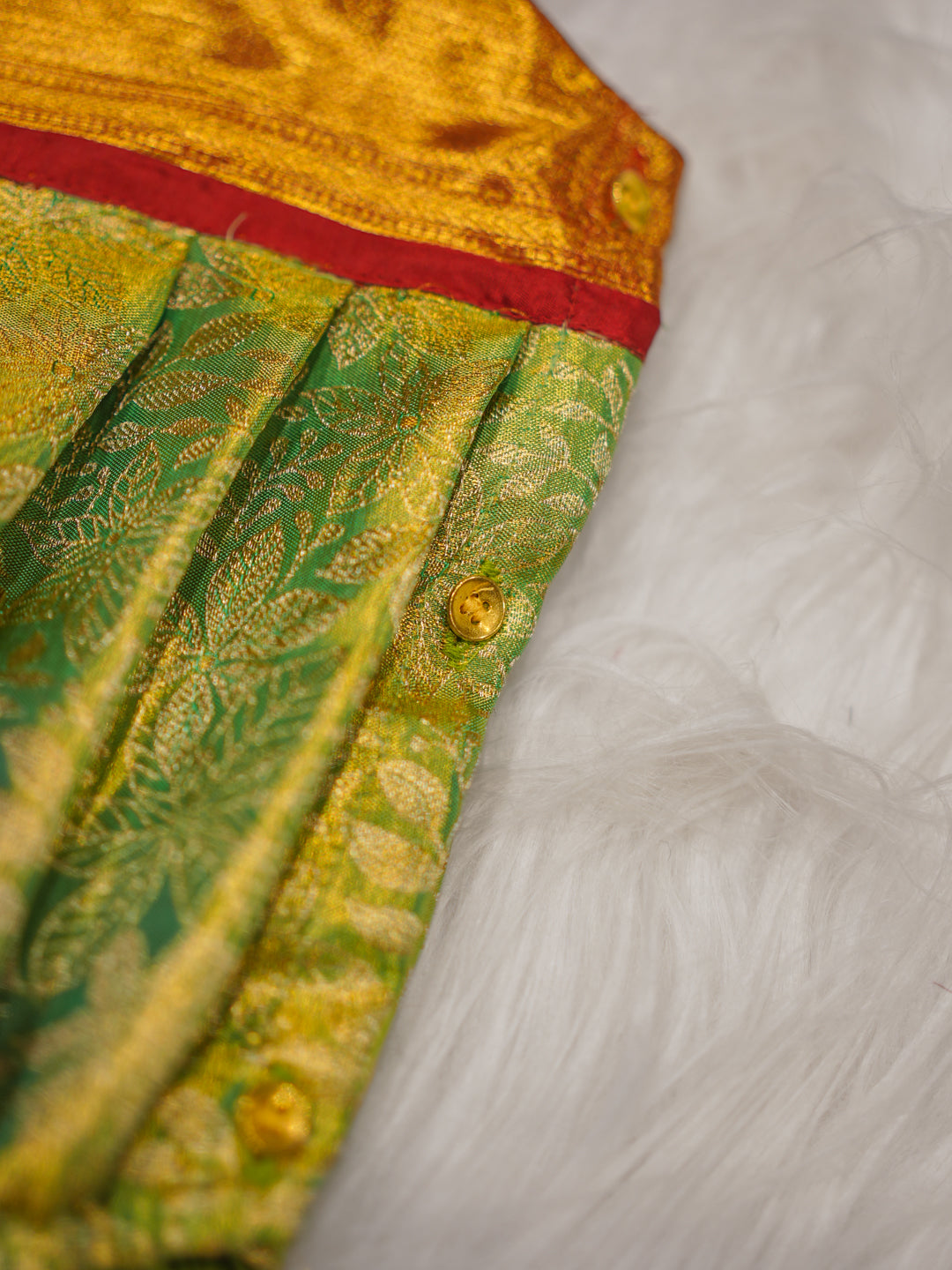 A celebration of heritage craftsmanship, this green silk romper is accented with a rich red and gold yoke, evoking temple-inspired elegance. Thoughtfully tailored for newborn comfort, it features soft gathers, smooth closures, and matching booties—making it a cherished keepsake for special moments.