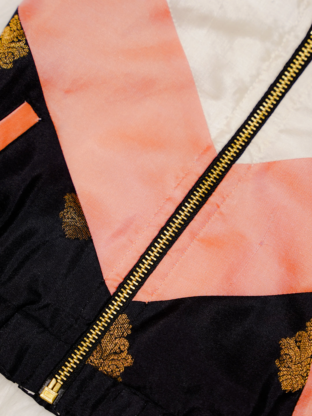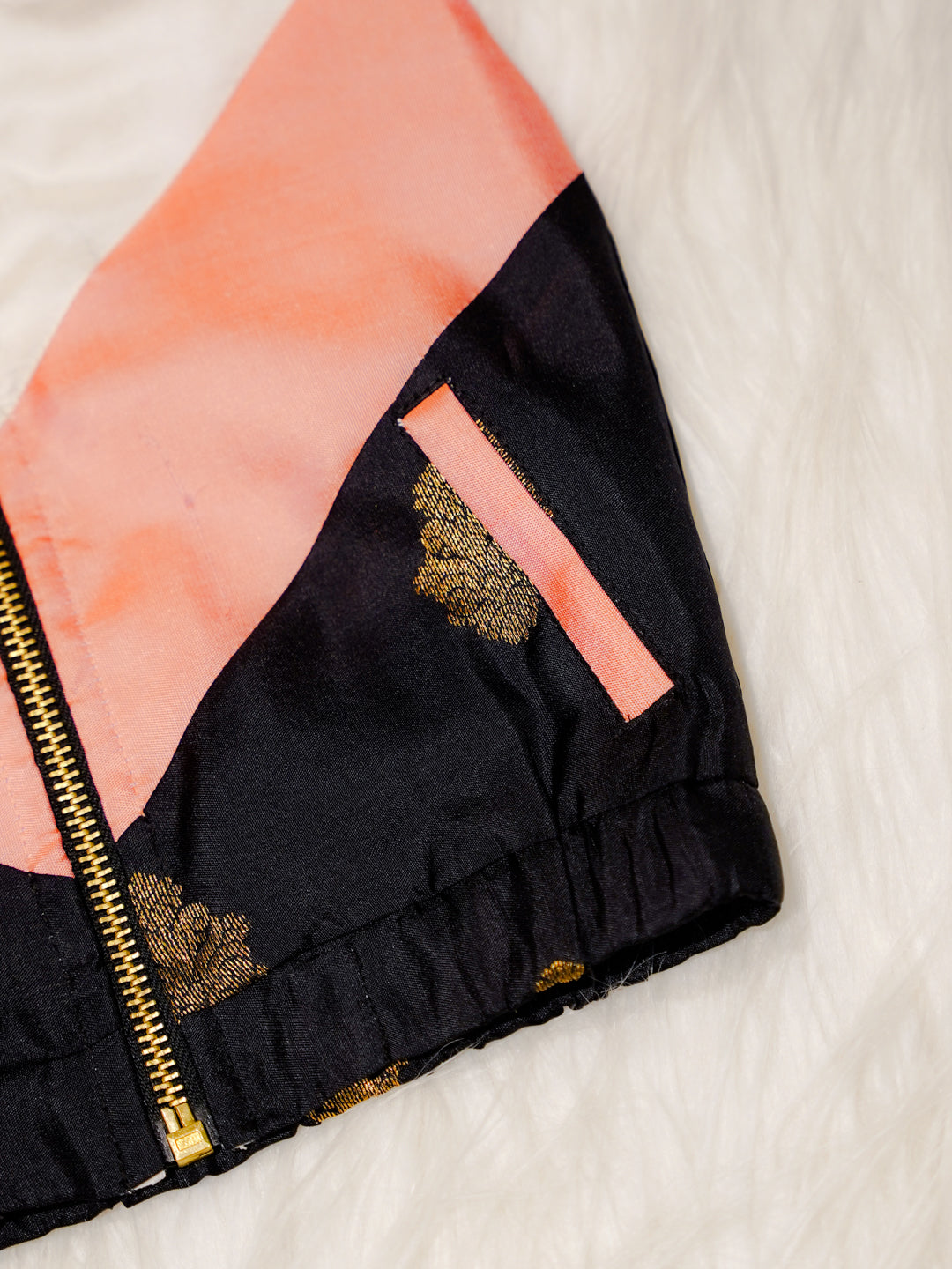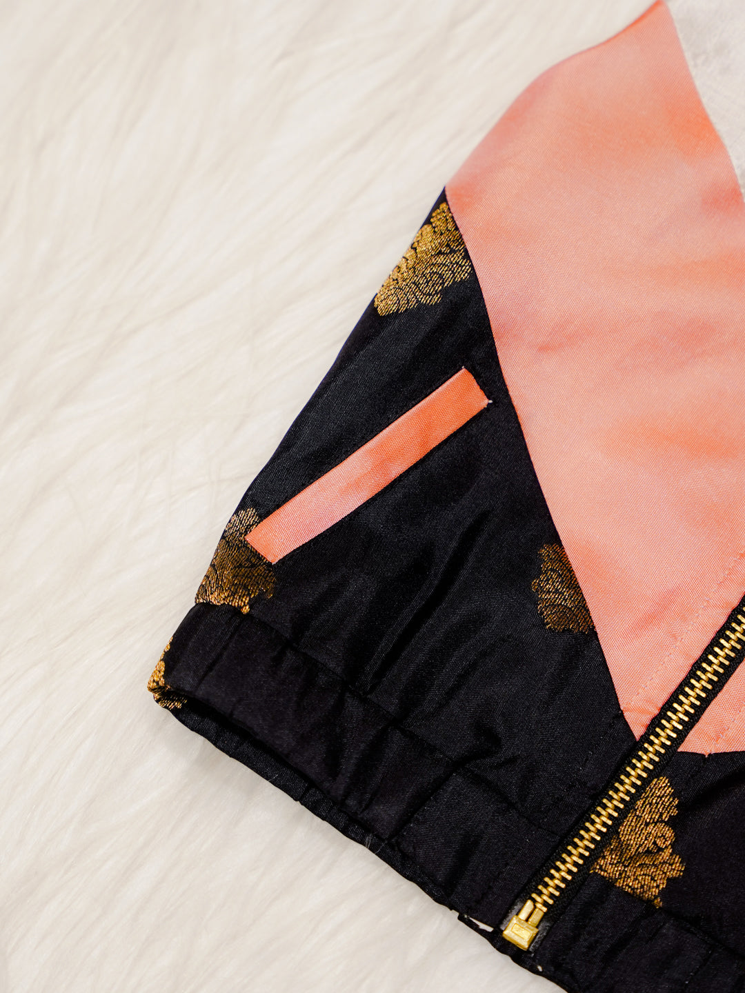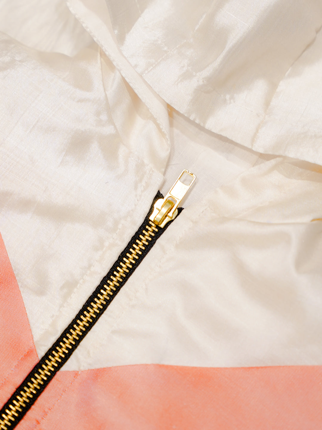 This Ivory Newborn Hooded Jacket features a soft ivory silk base complemented by peach contrast panels and subtle zari detailing. Crafted from Pure Kanchipuram Silk with Half Fine Zari, it offers a refined and elegant festive look.