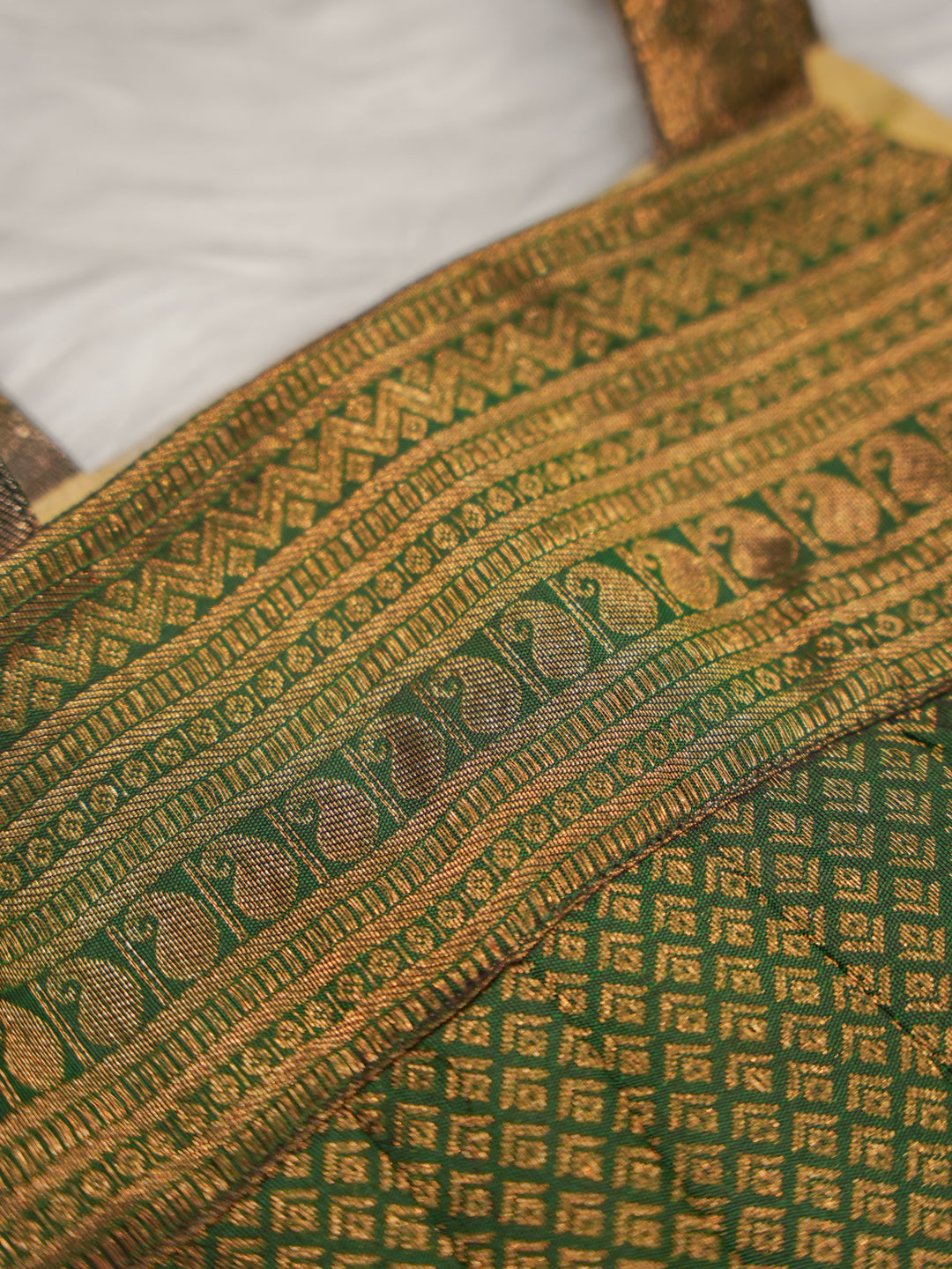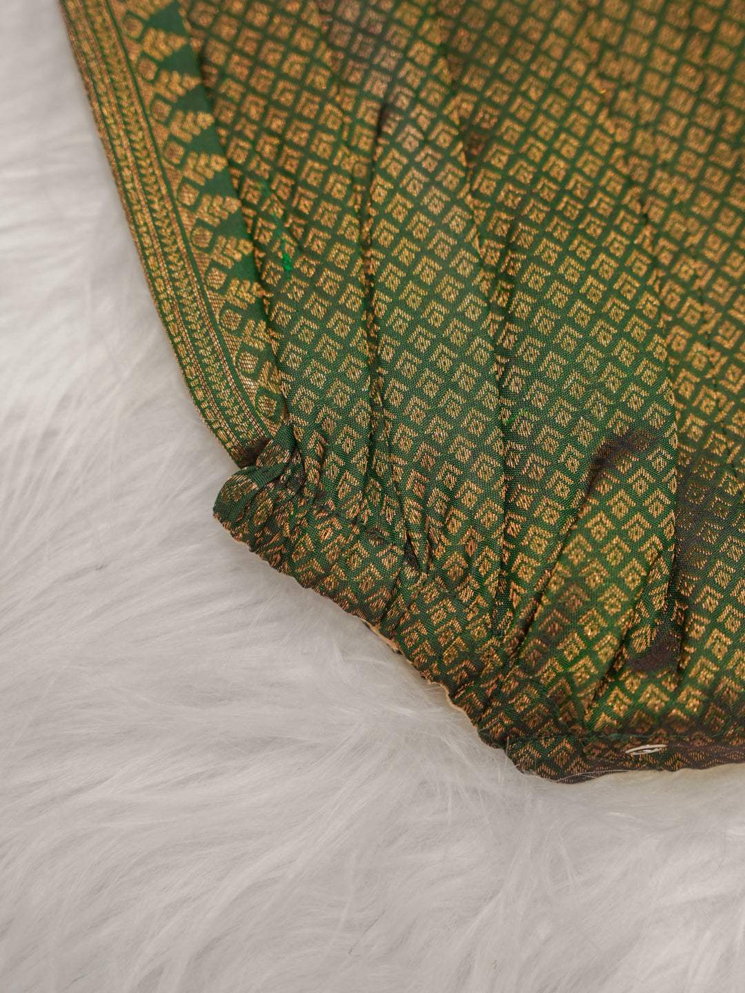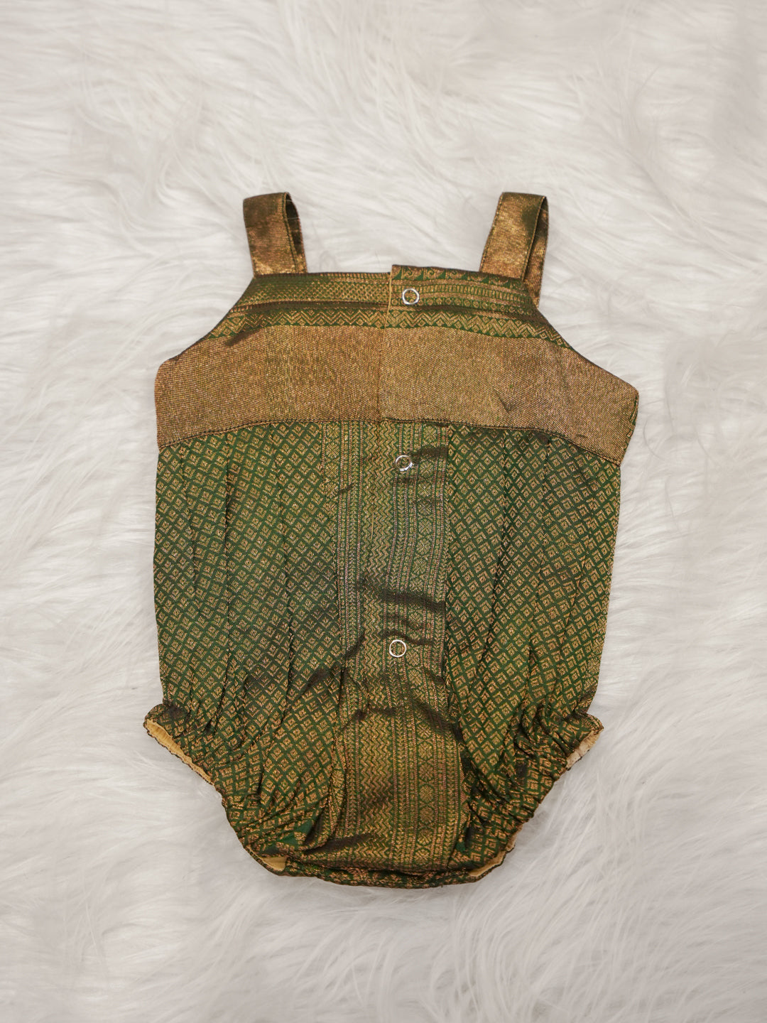 This pure Kanchipuram silk romper showcases a deep green and gold brocade with intricate borders and classic woven motifs. Created with premium silk craftsmanship, the silhouette is ideal for kids’ celebrations, fashion events, and Half Scale Fashion Week. Designed for comfort and elegance in every occasion.