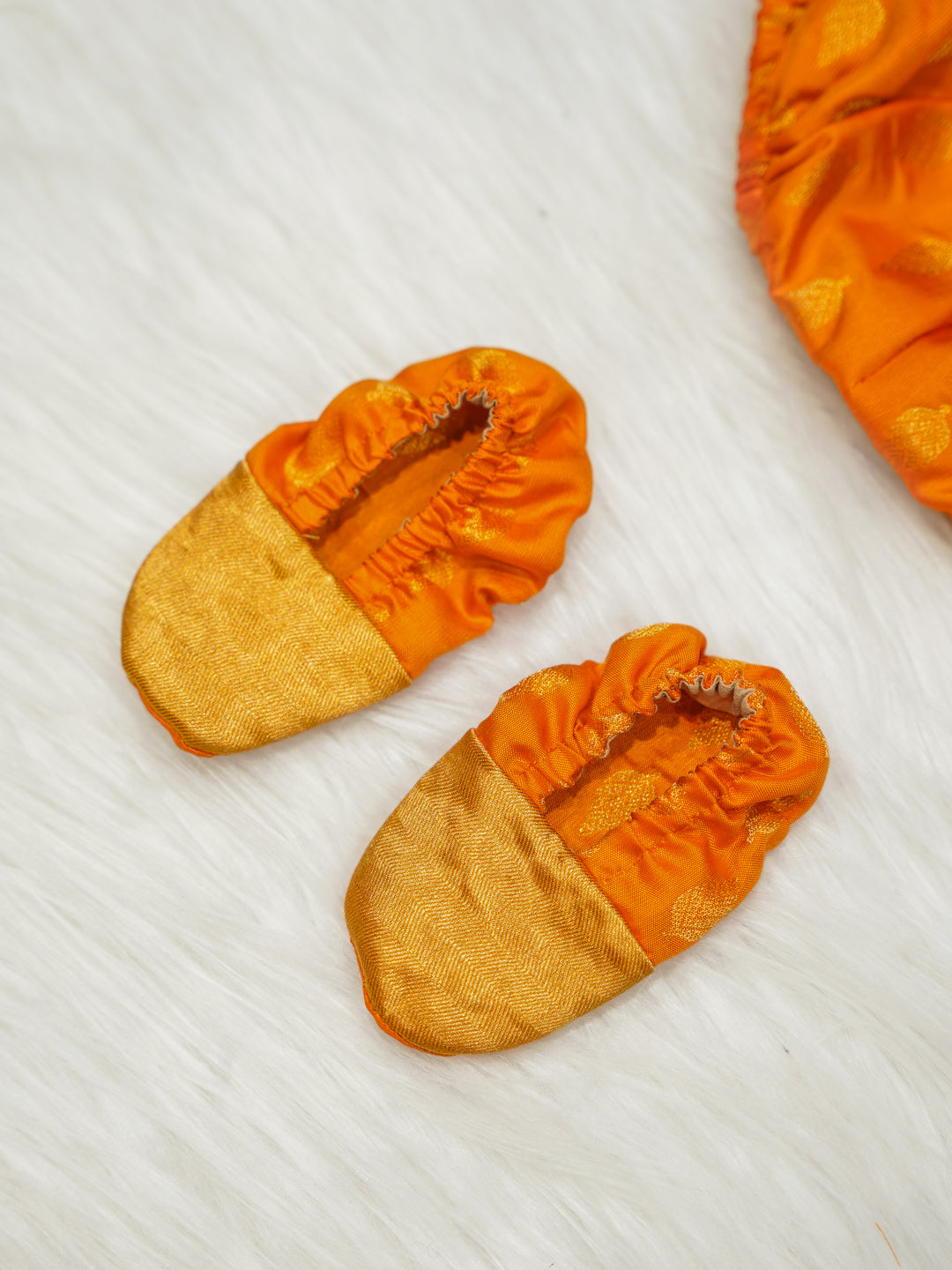 Bright, festive, and timeless, this marigold gold newborn romper is crafted from pure silk with delicate zari buttas. The classic gold yoke and warm tones make it a standout choice for traditional celebrations. Designed for newborn comfort, it includes elasticated leg openings, secure snap fastenings, and coordinated silk booties.