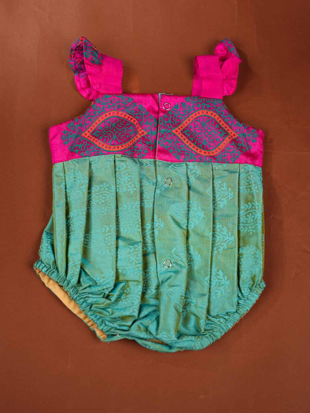 Let your little one shine bright in our Pink Parrot silk romper – a celebration of heritage and playfulness. Featuring a bold rani pink bodice with an intricate teal motif, and a lush pleated green silk base with traditional woven patterns, it blends tradition with cuteness for festive elegance.