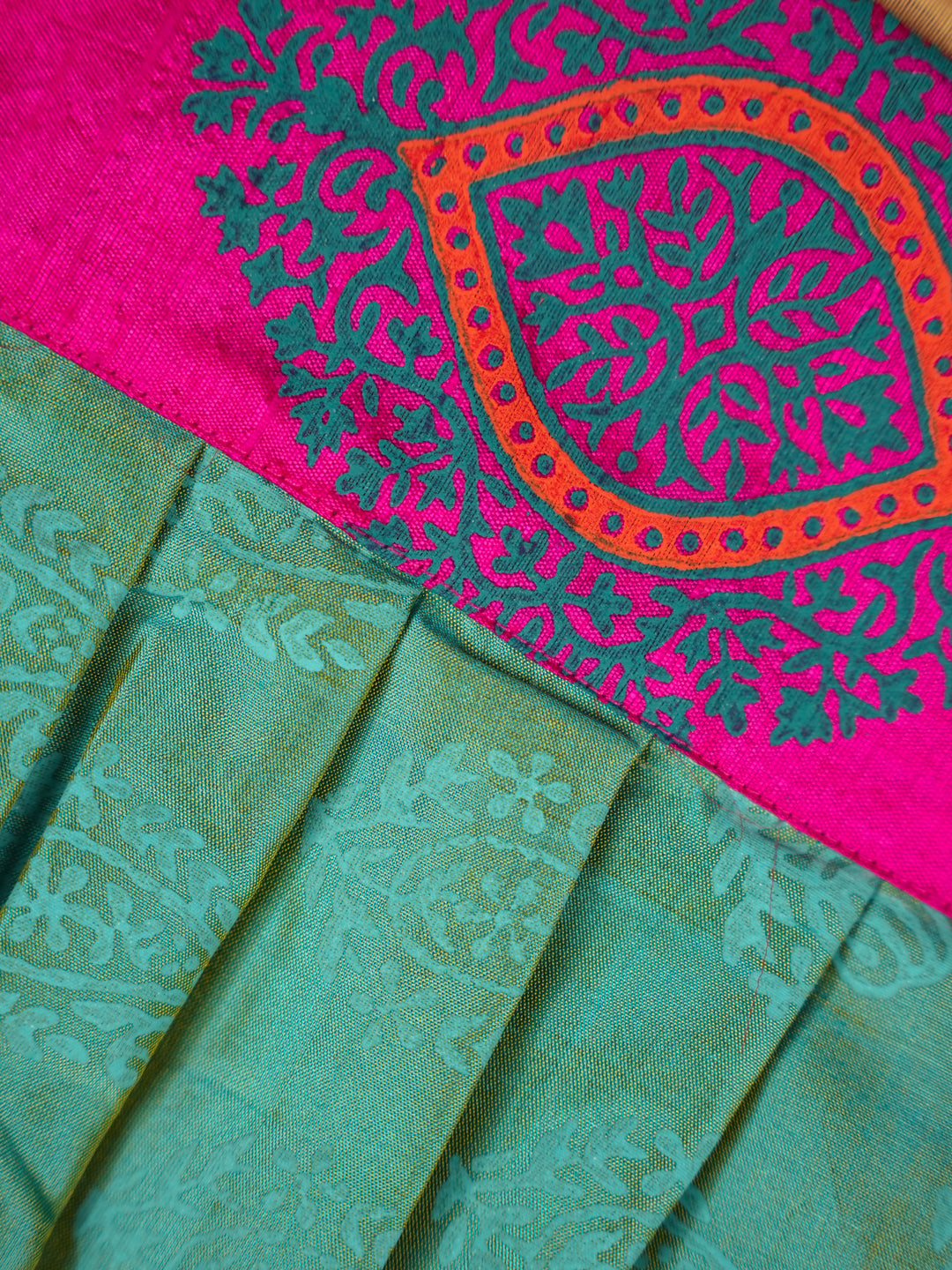 🌺 Bodice Color: Rani pink with teal traditional motif