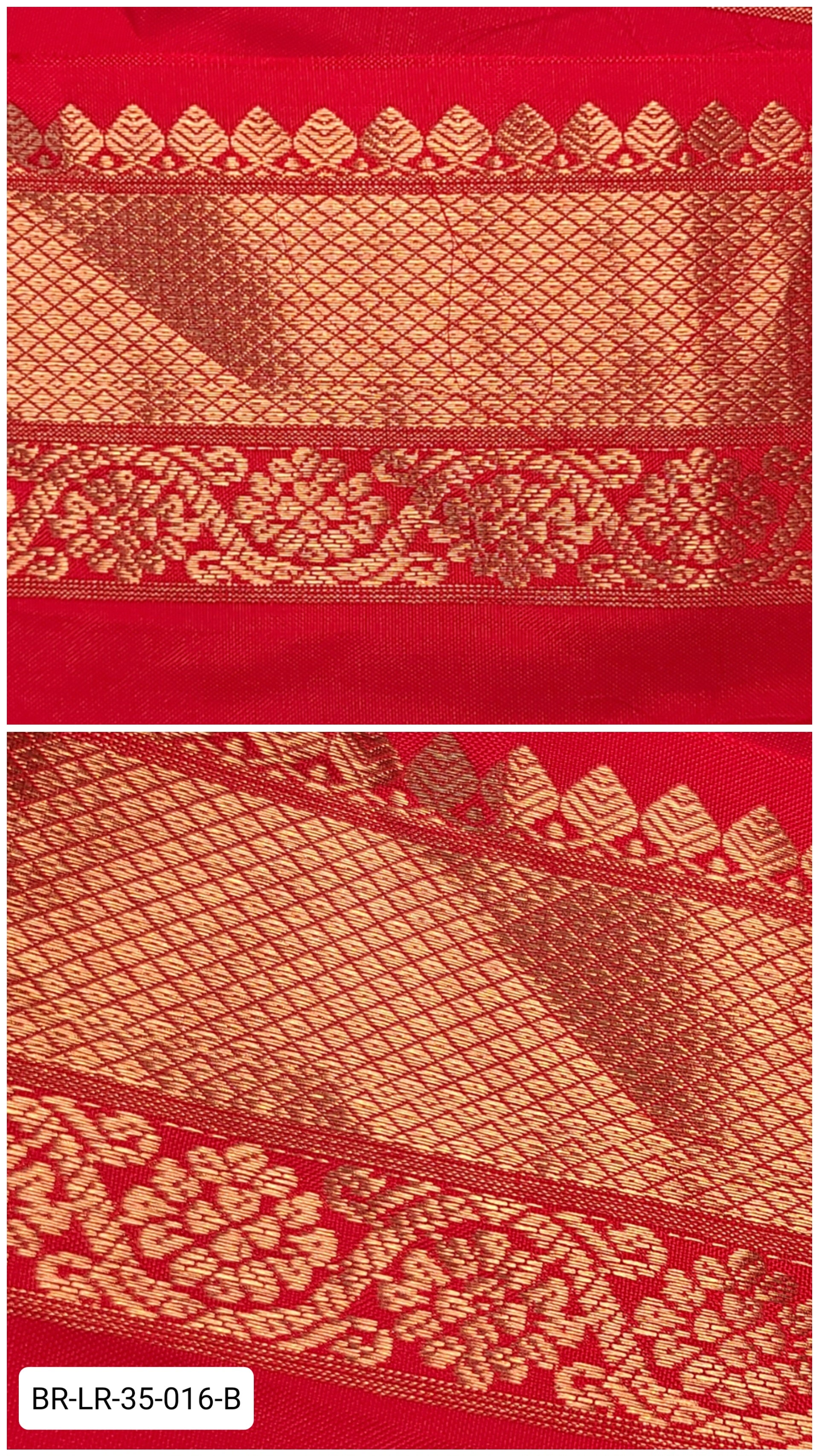 Bring richness and tradition to your outfits with this Pure Kanchipuram Silk Zari Border in a bright red base enhanced with gold zari detailing. The design features a diamond weave body, framed with temple-style leaf motifs on the top and an elegant floral vine pattern at the bottom.