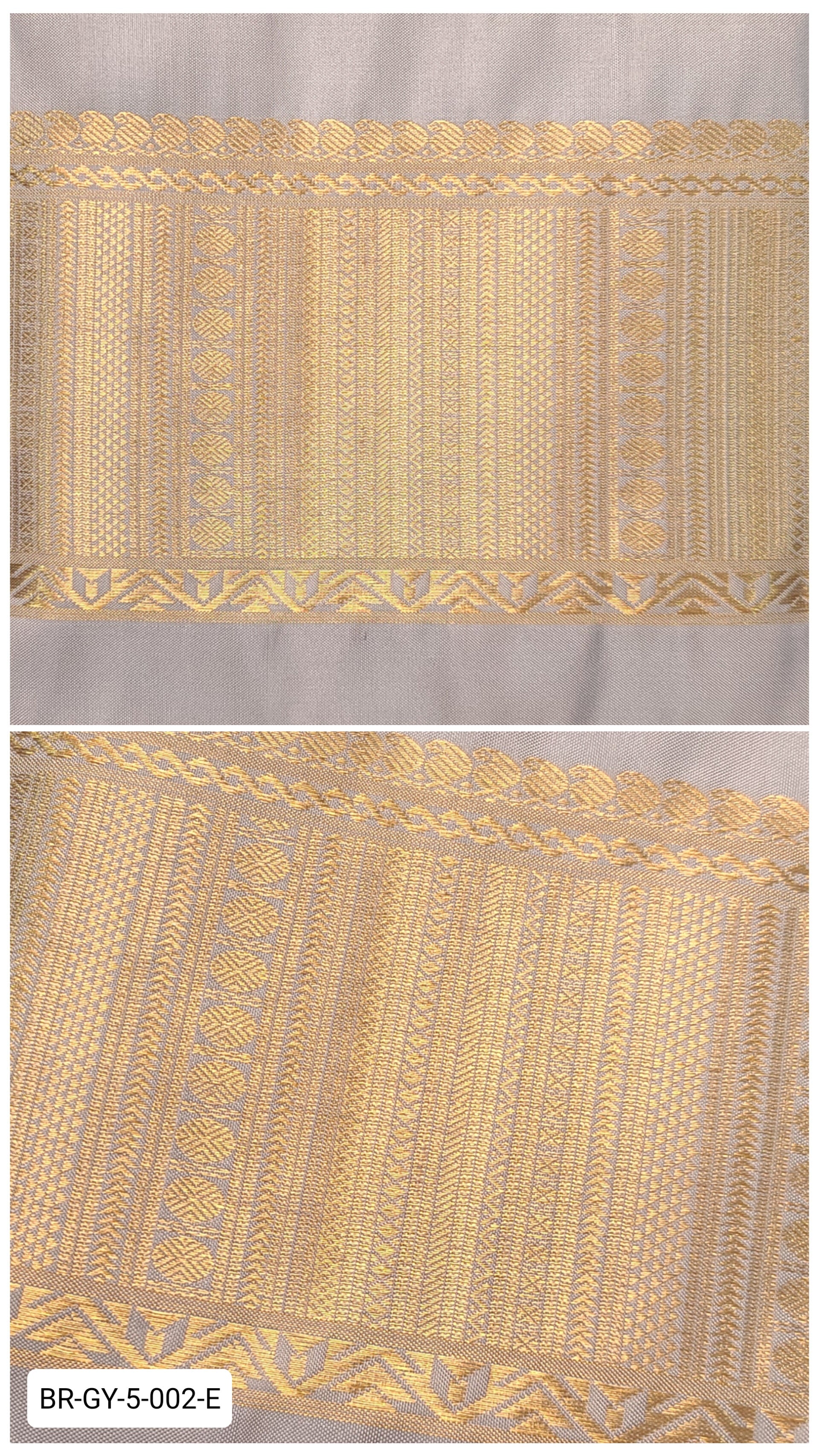 A sophisticated grey silk border intricately woven with gold zari stripes and textured geometric detailing.