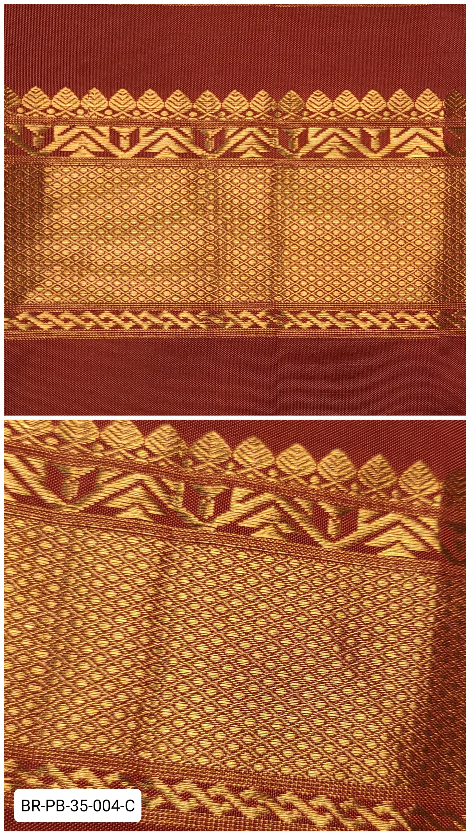 Add a touch of grandeur to your outfits with this handwoven Pure Kanchipuram Silk Zari Border in a striking rust red base highlighted with gold zari detailing. The border features an intricate diamond geometric weave, framed with temple-inspired triangular motifs and a row of leaf patterns for a traditional finish.