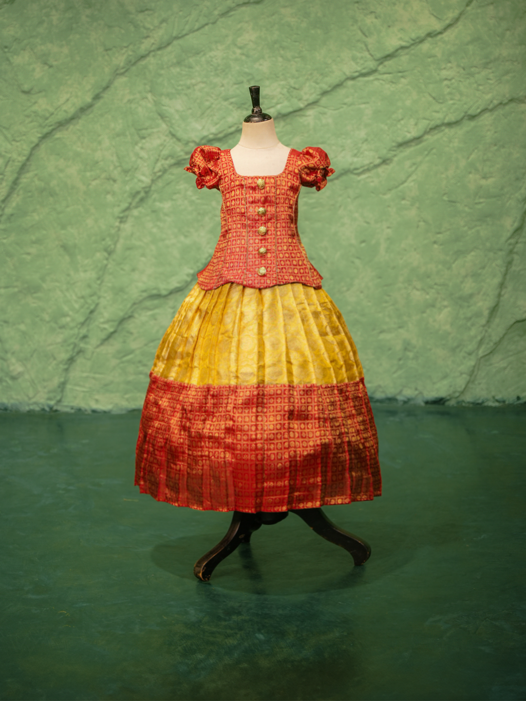 Bring out your little one’s festive charm with this pure Kanchipuram silk pattu pavadai. The rich red blouse features a golden checkered weave and puff sleeves for a traditional touch, while the golden yellow skirt is finished with a red zari pleated border. Handcrafted for comfort and elegance, this ensemble is perfect for weddings, festivals, and family occasions for girls aged 1–7.