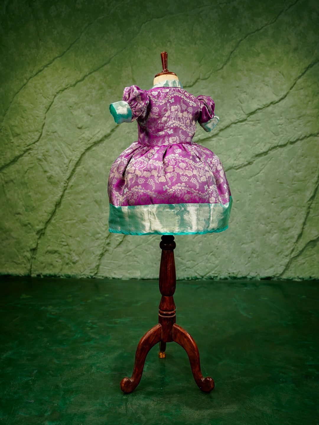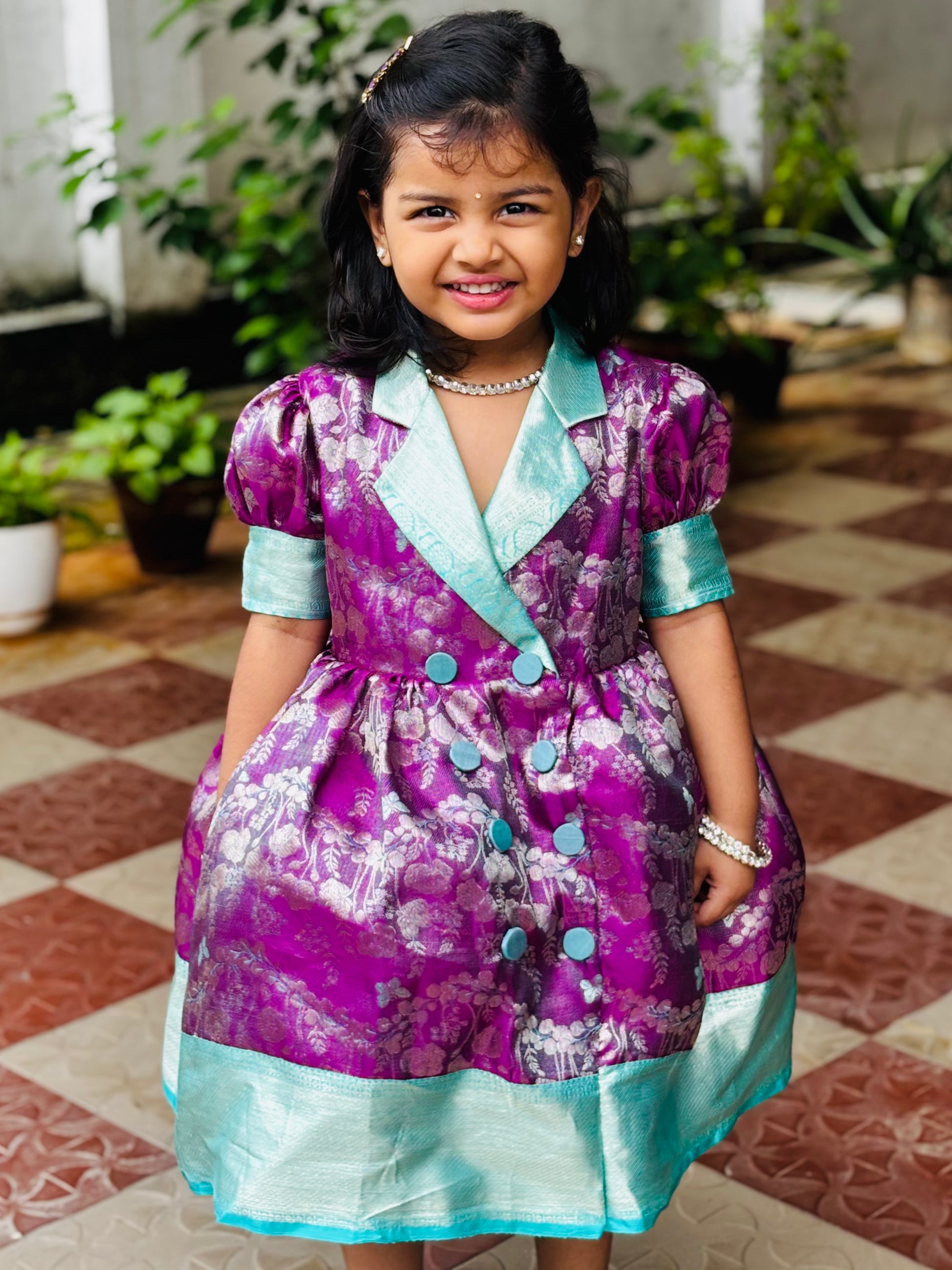 This graceful gown is woven from pure Kanchipuram silk, featuring a royal purple base adorned with silver zari floral motifs. Accented with aqua blue collar, cuffs, buttons, and a broad zari border, the jacket-style silhouette makes it a perfect blend of tradition and contemporary fashion for kids.