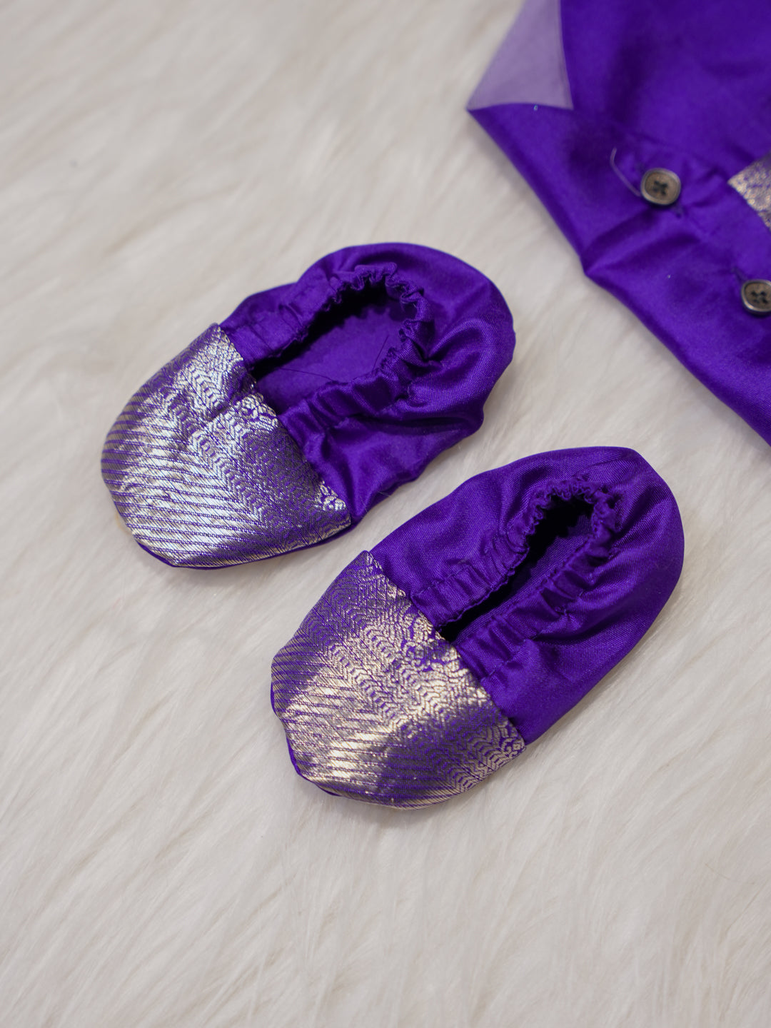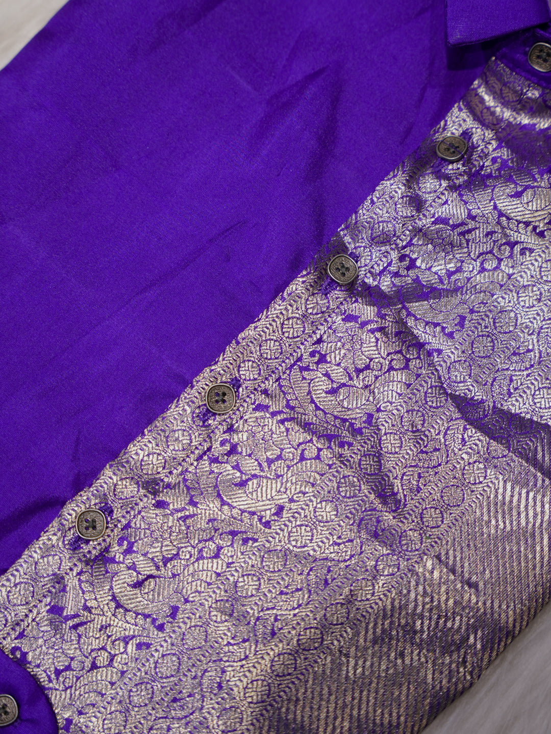Introduce your newborn to timeless elegance with this Royal Purple Newborn Silk Romper, crafted from Pure Kanchipuram Silk with Half Fine Zari. The rich royal purple silk body is enhanced by a striking zari panel, creating a refined fusion of traditional craftsmanship and modern formal styling.