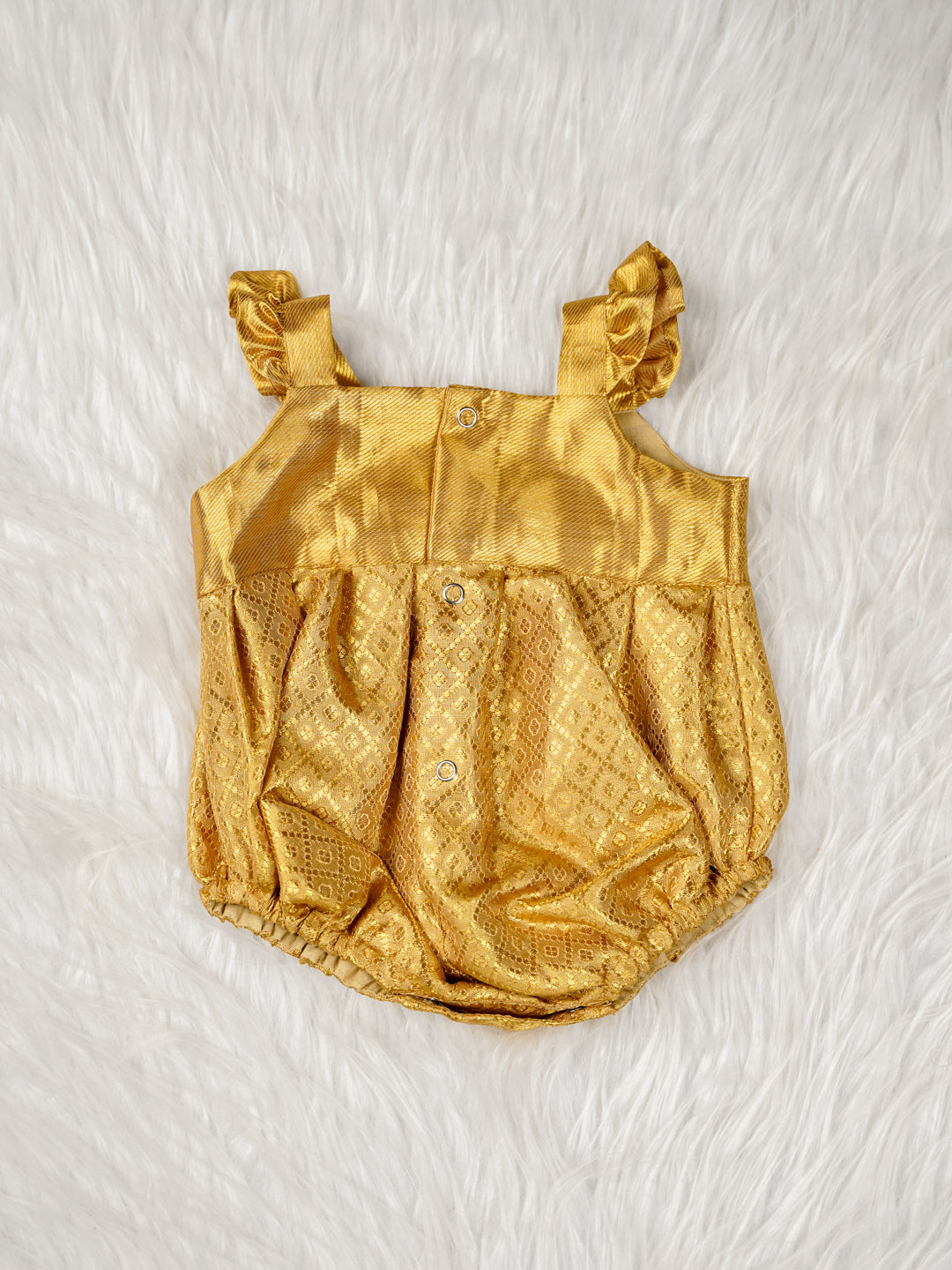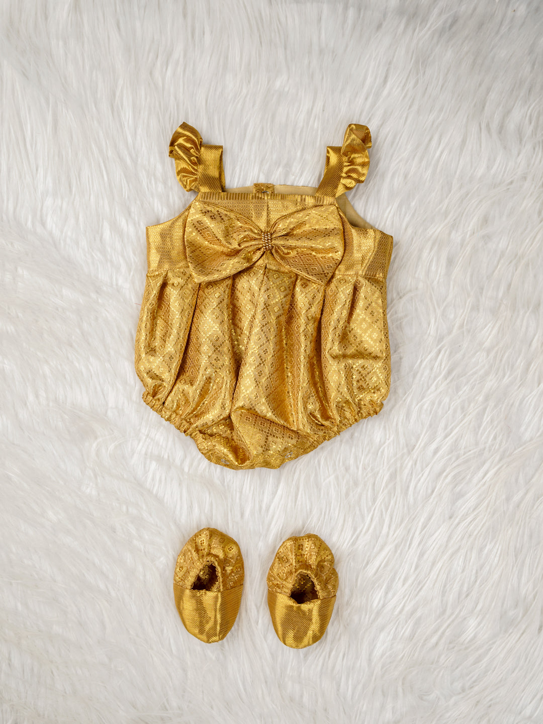 Let your little one shine in timeless grandeur. The Royal Radiance Baby Romper Set is a stunning traditional outfit handcrafted from lustrous golden Kanjivaram silk. With intricate woven motifs and a graceful bow accent at the chest, this romper captures the spirit of festive elegance. It comes with coordinated silk booties to complete the look, making it the perfect ensemble for naming ceremonies, weddings, and cultural celebrations.