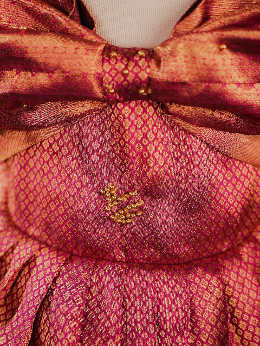 Turn every moment into a celebration with this Ruby Radiance Pattu Gown, a graceful fusion of tradition and contemporary style. Crafted in premium silk with a subtle geometric zari pattern, this deep pink and gold gown is highlighted by its oversized front bow and puff sleeves, adding a playful yet royal touch. The rich pleated skirt ensures flowy movement, perfect for twirls and pictures. Ideal for birthdays, festive gatherings, and traditional ceremonies.