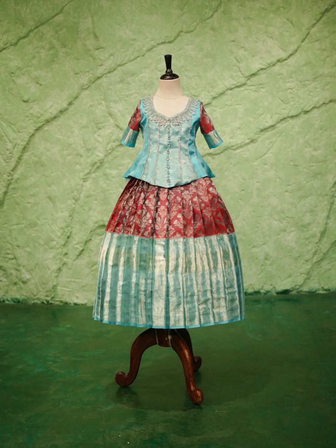 This exquisite pure Kanchipuram silk pattu pavadai blends elegance and tradition in every thread. The sky-blue blouse is adorned with shimmering beadwork along the neckline and button panel, paired with a richly woven maroon silk skirt featuring floral zari motifs and a pleated blue border. Handcrafted with comfort lining, it’s the perfect festive outfit for little girls aged 1 to 7 years.