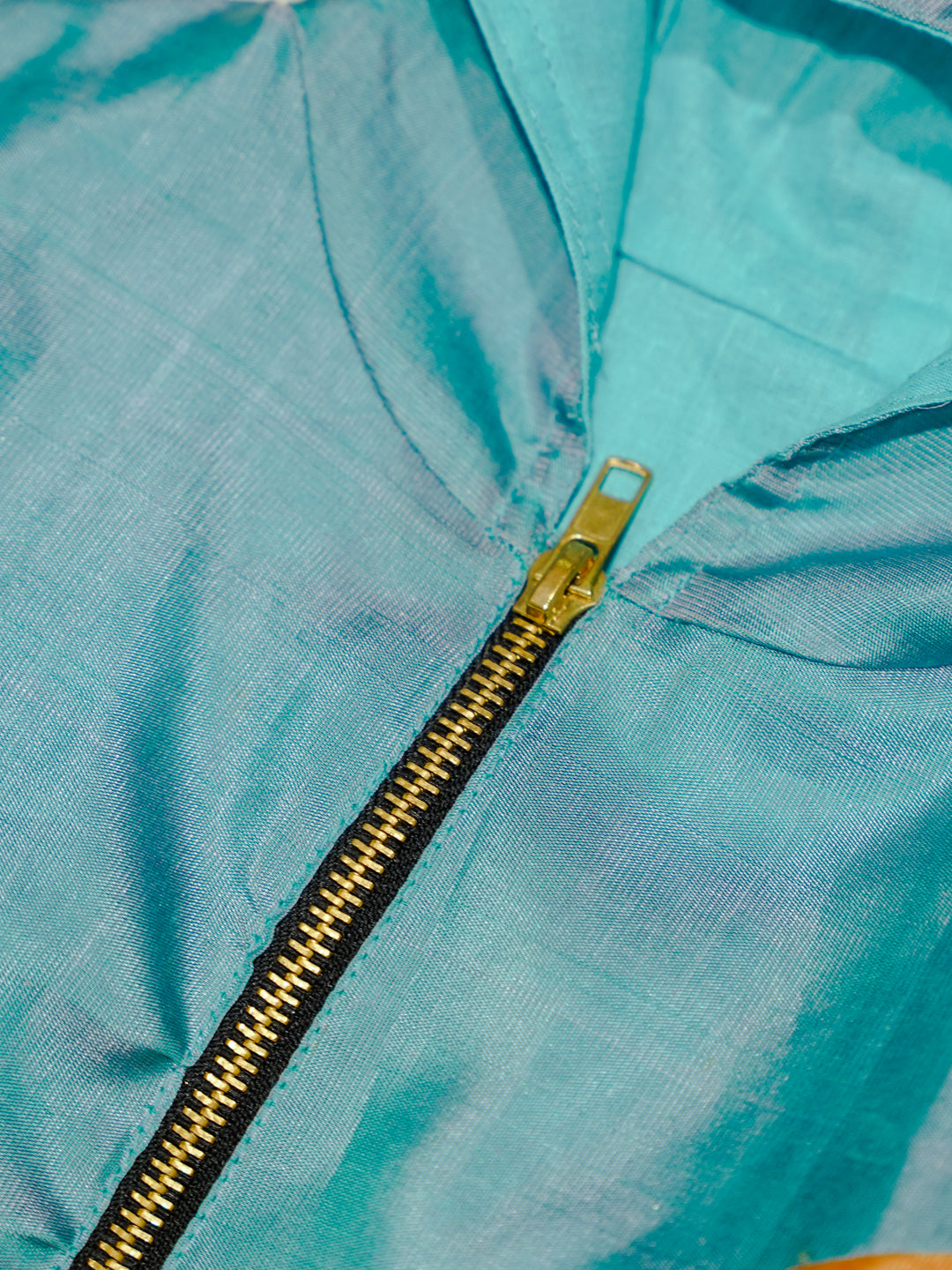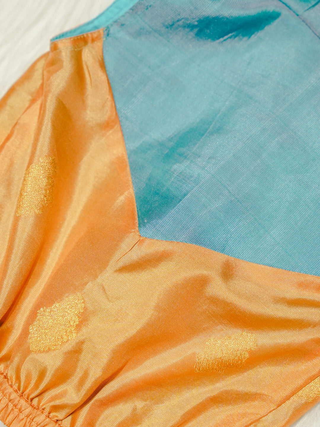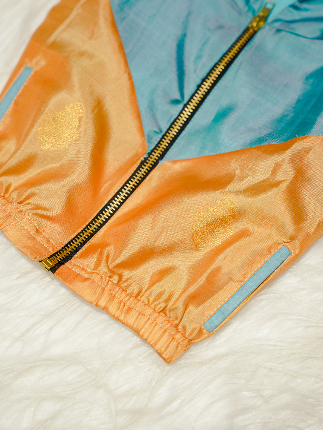 This Sky Blue Newborn Hooded Jacket features a vibrant combination of sky blue and peach silk crafted from Pure Kanchipuram Silk with Half Fine Zari. The zari woven motifs add subtle festive charm to the outfit.